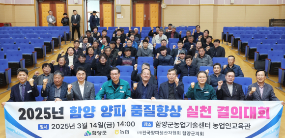 함양군은 3월 14일 함양군농업기술센터 농업인교육관에서 ‘함양 양파 품질향상 실천 결의대회’를 개최했다. 함양군과 농협, (사)전국양파생산자협회 함양군지회에서 공동 주관한 이번 결의대회에는 진병영 함양군수, 김윤택 군의장을 비롯해 군의원, 농협군지부장, 지역농협 조합장, 양파 재배 농가 등 80여 명이 참석해 함양 양파의 경쟁력 강화를 위한 결의를 다졌다. 이번 결의대회는 ▲양파의무자조금관리위원회 이홍주 회장의 양파 산업 동향 및 발전 방안에 대한 주제발표 ▲양파 품질 향상을 위한 간담회 ▲각 분야별 대표자 결의문 낭독 및 선서 등의 순서로 진행되었다.