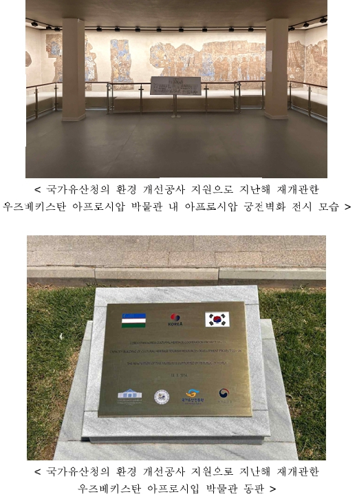 이를 바탕으로, 2024년에는 캄보디아 압사라청과 문화유산 교류협력 업무협약을 체결한 후, 세계에서 다섯 번째로 앙코르유적의 심장인 앙코르와트 보존복원사업에 착수하였다. 또한, 1,400년 전 한-우즈베크 문화교류의 증거인 아프로시압 궁전벽화가 있는 아프로시압 박물관의 전면 환경 개선공사를 지원해 59년 만에 재개관하였으며, 이집트 라메세움 신전 탑문 발굴조사를 통해 신전의 전체 구조를 파악할 수 있는 중요 단서를 확보하였다. 2013년부터 이어온 라오스 홍낭시다 ODA는 사원의 봉안소와 답도(통로) 복원정비를 완료하며 국무조정실의 ODA 우수사례 중 하나로 선정되었다. * 아프로시압 궁전벽화: 7세기 바르후만 왕 즉위식에 참석한 사절단 중 조우관을 쓰고 환두대도를 찬 고구려 사신으로 추정되는 인물 두 명이 그려져 있음. * 라메세움 신전: 람세스 2세의 장례의식을 집행하는 장제전(葬祭殿)으로 알려짐.