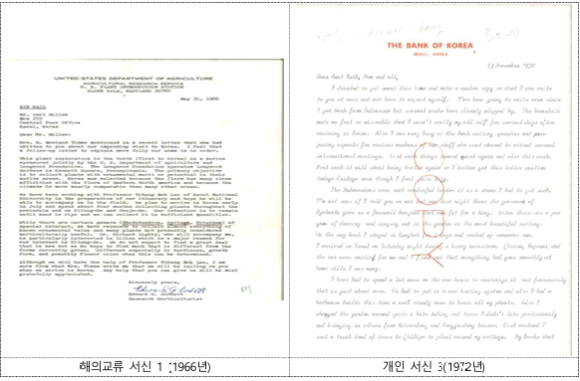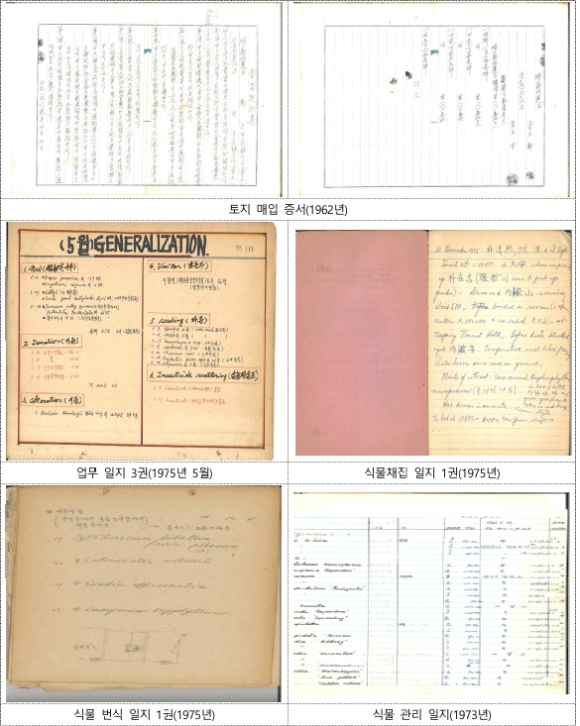 | 한편, 이번에 등록 예고된 「태안 천리포수목원 조성 관련 기록물」은 우리나라 최초의 사립수목원인 천리포수목원의 설립자 민병갈이 작성한 토지매입증서, 업무일지, 식물채집·번식·관리일지, 해외교류서신, 개인서신으로 구성되어 있다. 천리포 수목원의 조성 과정과 상황 등이 비교적 상세히 기록되어 있고, 식물학과 미기후 분야의 연구 자료로도 가치가 있다. * 민병갈(1921.4.5.~2002.4.8.): 미국계 귀화 한국인으로, 영어이름은 Carl Ferris Miller임. 토지매입증서는 1962년 수목원 조성을 위해 최초로 구입한 9,000㎡(2,727평)의 필지 관련 내용으로 매매금액이 적혀 있고, 업무일지에는 일자별 도입 식물 목록과 식재 위치도, 첫눈 등 기상상태가 포함되어 있다.