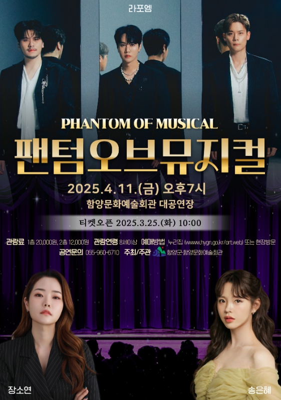 함양문화예술회관 관계자는 뮤지컬 명작의 감동과 크로스오버 음악의 매력을 결합한 환상적인 무대 ‘팬텀 오브 뮤지컬’공연을 통해 지역문화 예술의 발전과 함께 관객들에게 새로운 감동을 선사하고자 한다’고 전했다.