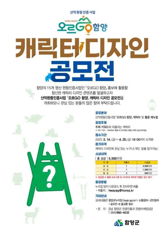 함양군이 지난 3월 14일부터 15개 명산 완등인증사업 ‘오르GO 함양’을 상징할 수 있는 대표 캐릭터 공모전을 시작했다. 이번 공모전은 함양군의 대표적인 산악 관광 콘텐츠인 ‘오르GO 함양’을 상징적으로 표현하면서 친근감을 동시에 담아낼 수 있는 캐릭터를 발굴하기 위해 마련됐다. 공모전 참여를 원하는 사람은 함양군청 대표 누리집 소통참여/공모전 게시판에 내 참가신청서를 내려받아 창작 캐릭터와 응용 디자인 등과 함께 4월 25일까지 전자우편(hwayag@korea.kr)을 통해 제출하면 된다.