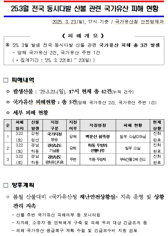 ’25.3월 전국 동시다발 산불 관련 국가유산 피해 현황국가유산 2건, 국가유산 주변 1건정호 기자 /