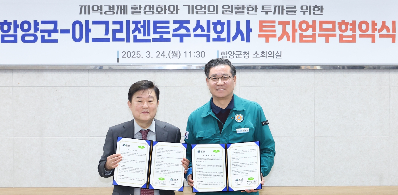 함양군, 아그리젠토 주식회사와 ‘투자유치 협약’ 체결일자리 창출 및 인구 유입 기대, 함양군수 “투자유치 위한 모든 노력을 쏟을 것”김주영 기자 / |