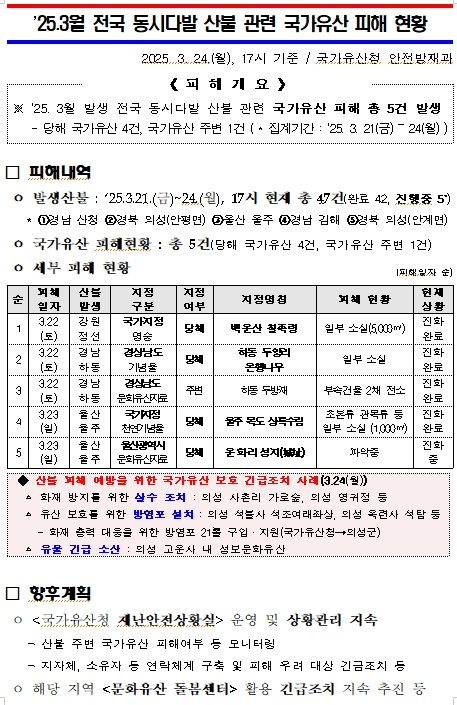 ’25.3월 전국 동시다발 산불 관련 국가유산 피해 현황국가유산 피해현황 : 총 5건(당해 국가유산 4건, 국가유산 주변 1건)정호 기자 /