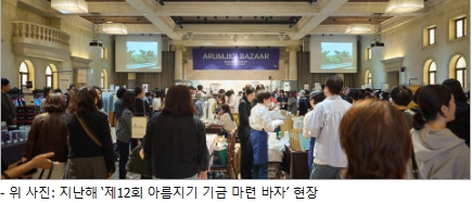 2025년 3월 25일 -- 재단법인 아름지기가 우리 전통문화의 연구와 계승, 발전을 위한 사업 기금을 마련하기 위해 오는 4월 3일 서울 강남구 역삼동의 ‘더 라움’에서 ‘제13회 아름지기 기금 마련 바자’를 개최한다.