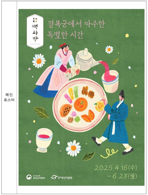 국가유산청(청장 최응천)은 국가유산진흥원(원장 최영창)과 함께 4월 16일부터 6월 23일까지 2025년 상반기 「경복궁 생과방」 행사를 개최한다. * 운영시간(회당 36명): (1부) 10:00, (2부) 11:40, (3부) 13:50, (4부) 15:30 / 약 70분간 * 기간 중 매주 화요일 미운영(경복궁 휴궁일)