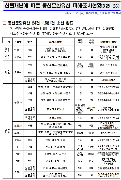 산불재난에 따른 동산문화유산 피해‧조치현황(3.25.~28.)5건(17점), 문화유산자료 1건(1점) 소산정호 기자 /
