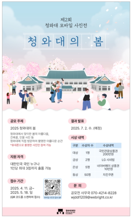 2025년 4월 1일 -- 청와대재단은 오는 4월 11일(금)부터 5월 18일(일)까지 ‘제2회 청와대 모바일 사진전’을 개최한다고 밝혔다.