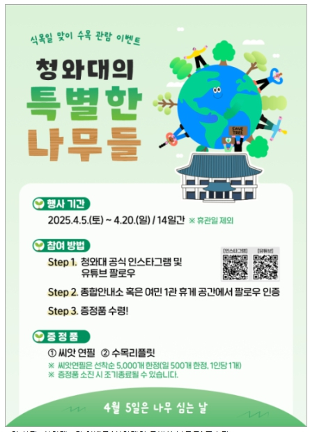 또한 식목일을 기념한 특별 이벤트도 열린다. 4월 5일(토)부터 20일(일)까지 ‘청와대의 특별한 나무들’ 이벤트가 운영되며, 청와대에 방문한 누리소통망(유튜브, 인스타그램) 구독자를 대상으로 씨앗연필과 청와대 내 주요 수목 정보를 담은 안내 책자(리플릿)를 증정한다. 씨앗연필은 방울토마토, 바질, 해바라기, 봉선화, 나팔꽃 등 5종의 씨앗이 내장된 친환경 제품으로, 지속 가능한 자연을 기념하는 의미를 담고 있다. 총 5000개 한정 수량이 마련돼 매일 500개씩 선착순으로 제공된다.