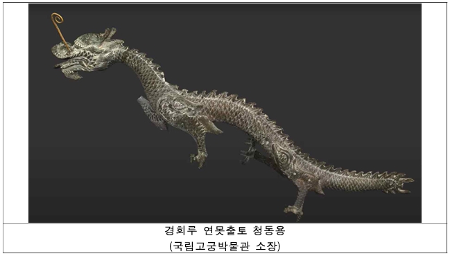 | * 경회루 연못출토 청동용(국립고궁박물관 소장): 경복궁 중건 당시인 1865년 화재 방지용으로 제작되어 연못에 넣어진 것으로 알려져 있으며, 1997년 11월 경복궁 경회루 연못 준설작업 도중에 경회루 북쪽 하향정(荷香亭) 앞 연못 바닥에서 출토. 길이는 146.5cm. 한편, 4월 16일부터 18일까지 3일간 인천국제공항 제1터미널 교통센터(인천 중구)에서 새로운 미디어월을 담은 엽서와 여행가방 이름표 등 전통문화상품을 방문객 2,000명에게 증정하는 홍보 행사도 개최한다. 행사에 관한 자세한 내용은 국립고궁박물관(https://gogung.go.kr)과 국가유산진흥원(https://www.kh.or.kr) 누리집에서 확인할 수 있다.