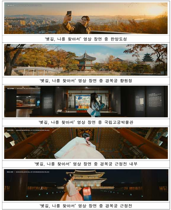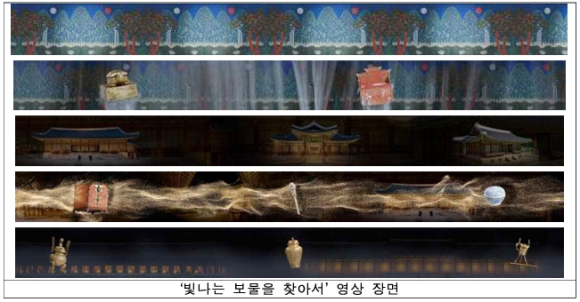 | 이번에 새롭게 단장한 ‘전통문화 미디어월’에서는 국가유산과 왕실 문화유산을 담은 미디어월 콘텐츠 두 편을 처음으로 선보인다. ▲ 1편 ‘옛길, 나를 찾아서’는 한양도성길을 따라 남산을 오르거나, 경복궁으로 이동하여 국립고궁박물관, 경복궁 근정전을 바라보는 등 서울의 주요 명소를 방문하는 다양한 시점의 인물들을 통해 한국 여행에 대한 기대감을 선사한다. ▲ 2편 ‘빛나는 보물을 찾아서’는 3차원으로 재현한 어보, 종묘 제기 등의 국립고궁박물관 소장 왕실유물을 금빛 모래와 안개, 물보라 등의 효과와 함께 연출한 미디어 아트로, 조선 왕실의 위엄과 신비로움을 표현하였다.