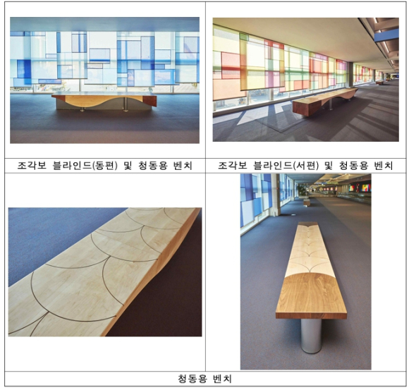 ‘전통문화 미디어월’과 함께, 문화유산을 응용하여 디자인한 휴게시설을 개선하여 내외국인들이 긴 입국 과정에서 자연스럽게 한국의 문화를 경험할 수 있도록 하였다. 동·서편 입국장에 전통 조각보를 소재로 한 가리개(블라인드)를 설치하여, 은은한 색감과 자연광이 어우러지는 따뜻한 정서와 감각적인 분위기를 연출하였다. 해가 뜨는 동편 입국장은 푸른 계열, 석양이 지는 서편은 붉은 계열의 색감을 사용했다.
