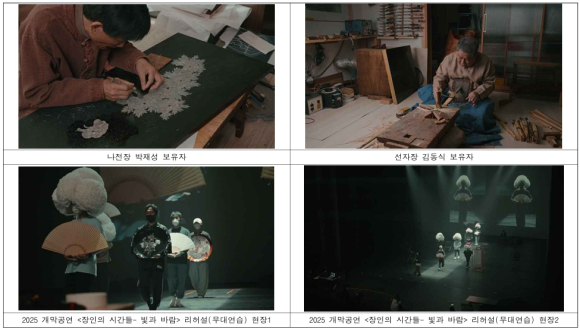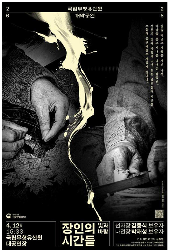 이번 개막공연 <장인의 시간들- 빛과 바람>은 국가무형유산 선자장 김동식 보유자와 나전장 박재성 보유자의 삶과 예술혼을 현대적인 무대 연출과 조명, 음악으로 표현하여 관람객들에게 새로운 문화적 경험을 선사할 예정이다.