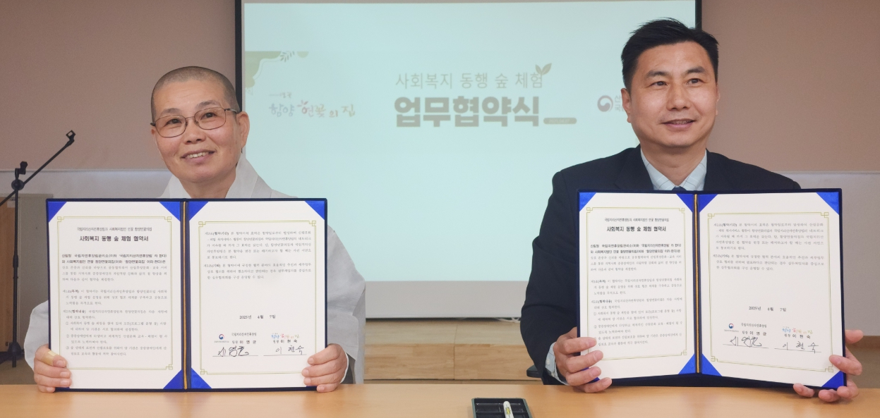 중증장애인 거주시설 함양연꽃의집과 산림청 국립지리산자연휴양림과은 4월 7일 함양연꽃의집에서 ‘사회복지 동행 숲 체험’ 업무협약식을 진행하였다.
