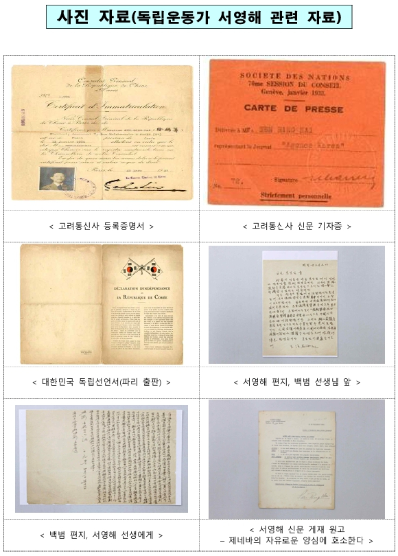 | 한편, 이번에 등록 예고되는 「독립운동가 서영해 관련 자료」는 일제강점기 유럽에서 독립운동을 주도적으로 이끌었던 서영해가 프랑스 파리에 고려통신사를 설립(1929년)하고, 고려통신사를 중심으로 대한민국임시정부 외교 특파원 등으로 활동하면서 유럽 각국에 일제의 침략상을 국제 사회에 고발하는 등 대한민국임시정부의 일원으로 한국 독립을 위해 수행했던 외교 활동의 흔적을 확인할 수 있는 귀중한 자료이다. * 서영해(본명: 서희수(徐羲洙), 1902년) : 독립운동가, 작가, 언론인, 교육인 등으로 활동함.