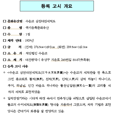 「수운교 삼천대천세계도」는 불교의 수미세계도의 형식을 빌려 민족종교인 수운교의 우주관 및 세계관을 표현한 종교화이며, 수운교의 교리로 평가된다. * 수운교(水雲敎): 1923년에 창시된 민족종교로, 동학의 창시자인 최제우(崔濟愚, 1824~1864)의 호 수운(水雲)에서 따온 명칭임. * 수미세계도(須彌世界圖): 불교의 수미산을 중심으로 한 우주관을 표현한 종교화