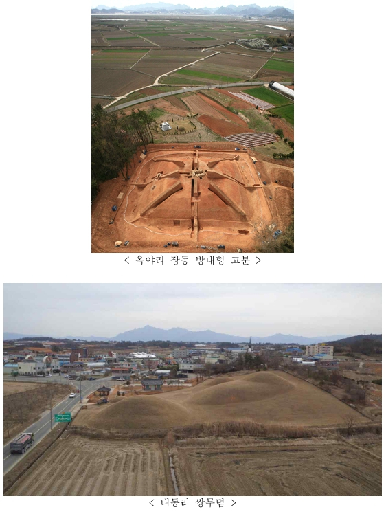 | 5세기 중엽 ‘옥야리 장동 방대형 고분’을 시작으로 영산강유역에 등장한 고총고분은 ‘내동리 쌍무덤’으로 이어지는데, 이를 통해 마한 고유의 전통적 옹관묘에서 벗어나 거대한 방대형 분구의 석곽·석실묘로 발전했음을 알 수 있다. 이들 유적에는 점토덩이를 이용하여 방사형이나 동심원 형태로 구획(토지 따위를 경계를 갈라 정함)하고 구획된 영역을 성토(흙을 쌓음)하는 방식이 적용된 것으로 확인되는데, 이는 이들 유적이 계획적으로 설계되었음을 알려주는 동시에, 당대 토목기술의 수준을 보여준다. * 고총고분(高塚古墳) : 흙과 돌을 사용하여 일정한 묘역을 설정하고, 분구를 높게 쌓아 올린 고분 * 방대형(方臺形) : 규모가 큰 네모 형태(방형)