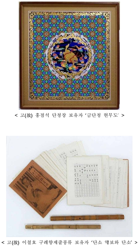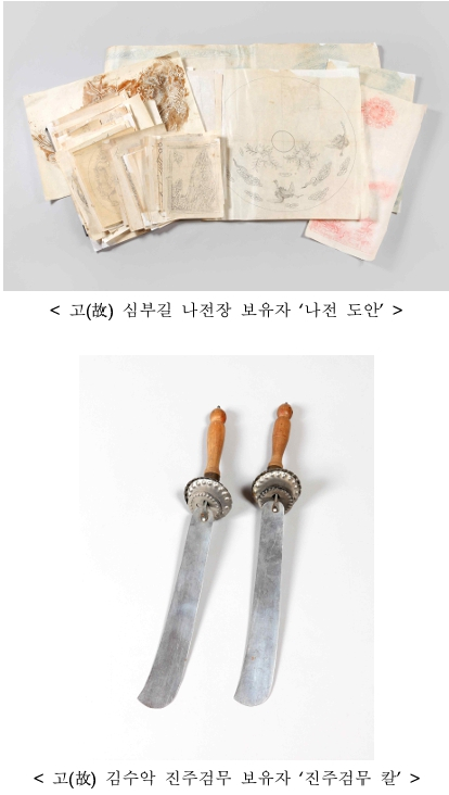 작년 한 해 동안 기증된 자료는 고(故) 홍점석 단청장 보유자, 고(故) 이철호 구례향제줄풍류 보유자, 고(故) 심부길 나전장 보유자, 고(故) 김수악 진주검무 보유자의 소장자료 등 총 459건(1,004점)이다.