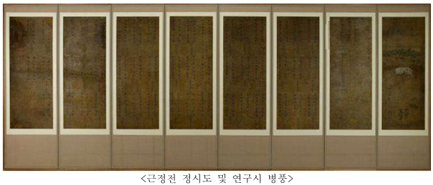 | 「근정전 정시도 및 연구시 병풍」은 궁중 행사를 표현한 병풍 중 이른 시기의 사례이자 제작 시기가 명확한 기년작으로 회화사적 가치가 크다. 경복궁 옛 터의 광화문, 근정전, 경회루 등이 상세히 묘사된 점에는 영조가 경복궁 옛 터를 중시했던 기조가 반영되어 있으며, 영조가 추진한 탕평책의 핵심 인물들이 연구시를 지은 것을 토대로 작품의 제작 배경 등을 파악할 수 있으므로, 이 작품은 단순히 왕실 행사의 기록 그림을 넘어, 영조의 정치 철학과 국가 운영 방식을 시각적으로 담아낸 중요한 자료라 평가되므로 보물로 지정해 연구하고 보존할 가치가 충분하다.