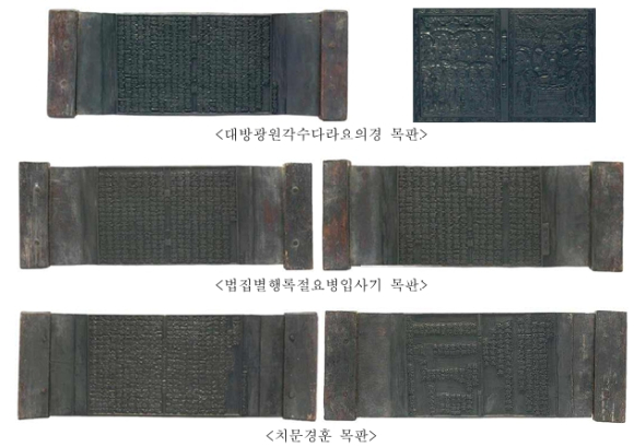 4건 중 제작 시기가 가장 빠른 「천지명양수륙재의찬요 목판(天地冥陽水陸齋儀纂要 木板)」은 1515년(중종 10년) 조성된 목판으로, 총 33판 완질이다. 각선(覺禪) 선사의 주도 아래, 처호(處浩)가 목판을 제작하고 최호(崔浩)가 글자를 새겨 만들어졌다. * 천지명양수륙재의찬요: 고려 후기 승려 죽암(竹庵)에 의해 편찬된 불교 의식집으로, 수륙재 때 행하는 여러 의식 절차를 정리한 것임.