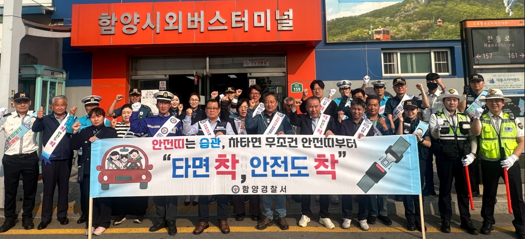 함양경찰서, 대형버스 운전자 대상 안전띠 미착용 캠페인 실시▲안전띠 매기 습관화 ▲뒷좌석 안전띠 의무화 ▲불량 착용 금지 등 홍보김주영 기자 / |