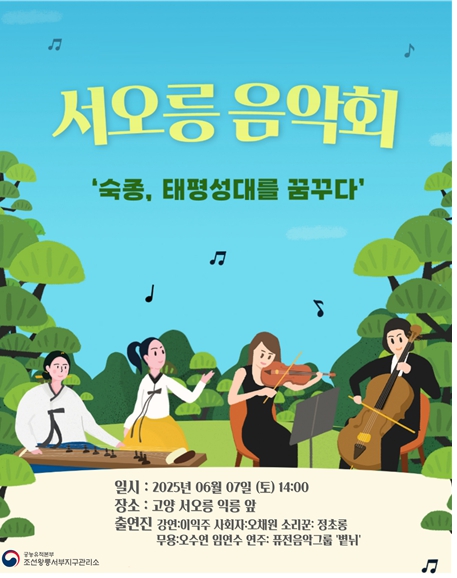 국가유산청 궁능유적본부 조선왕릉서부지구관리소(소장 김미란)는 오는 6월 7일 오후 2시, 세계유산 조선왕릉 중 하나인 고양 서오릉(경기 고양시)에서 <서오릉 음악회-숙종, 태평성대를 꿈꾸다>를 개최한다.
