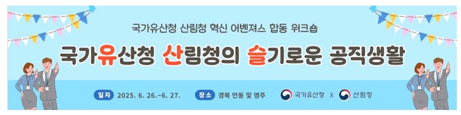 국가유산청(청장 최응천)은 6월 26일부터 27일까지 양일간 경북 안동 및 영주 일원에서 국가유산청-산림청 정부혁신 어벤져스 공동 연수(워크숍) 「유산슬」을 개최한다. * 어벤져스: 젊고 참신한 아이디어를 지닌 5급 이하 신규 공무원으로 구성하여, 정부혁신 아이디어 창출, 공유하기 위한 모임(2019년부터 정부 부처별 운영) * 유산슬: ‘국가유산청과 산림청의 슬기로운 공직생활’을 위하여 기관 간의 칸막이를 해소하고 다양한 협력 아이디어를 발굴한다는 의미