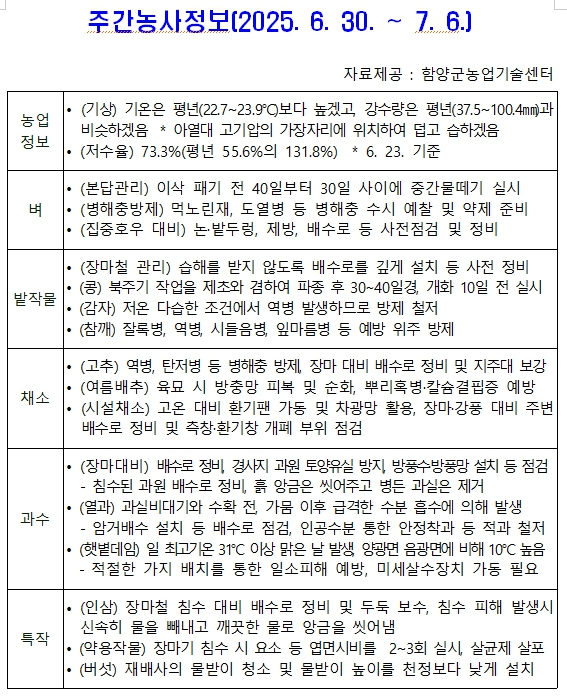 함양군 주간농사정보(저수율) 73.3%(평년 55.6%의 131.8%)한용택 기자 /