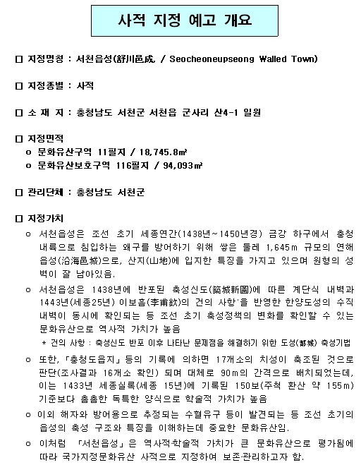 국가유산청(청장 허민)은 충청남도 서천군에 위치한 「서천읍성(舒川邑城)」을 국가지정문화유산 사적으로 지정 예고하였다.