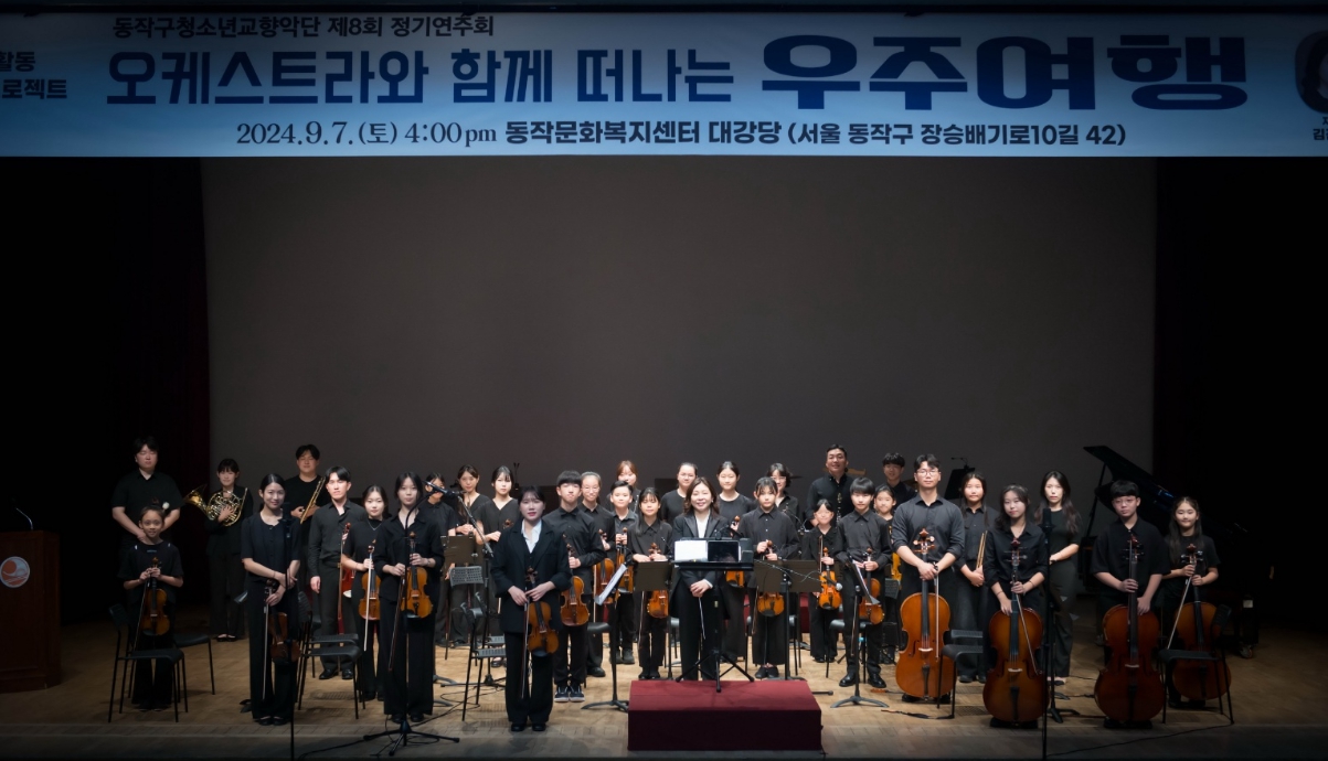 | 한편 ‘음악이 있는 아름다운 세상’이라는 모토 아래 창의·지혜·협동을 비전으로 키워나가는 동작구청소년관현악단은 한중청소년오케스트라교류음악회, 천안시청청소년교향악축제, 동작예술인페스티벌 폐막공연, 2025동작구청신년인사회 초청연주 등 다양한 연주활동을 펼쳐오며 높은 음악성과 감동적인 무대로 지역 문화예술 발전에 기여해 왔다.