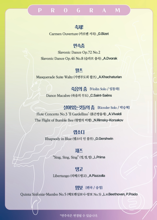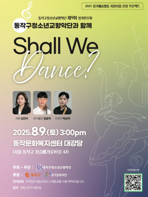 서울시 동작구청소년교향악단이 오는 8월 9일 오후 3시, 동작문화복지센터 대강당 (서울 동작구 장승배기로10길 42)에서 2025년 정기연주회 ‘Shell We Dance?’를 개최한다. 올해로 9회째를 맞이한 정기연주회는 ‘Shell We Dance?’를 주제로 ‘동작구’의 ‘동작’이라는 단어가 주는 중의적인 의미의 Dance의 이미지를 활용하여 발레, 왈츠, 폴카, 탱고, 라틴댄스 등 여러 문화의 춤과 관련된 다양한 음악으로 무대를 구성했다. 특히 청소년교향악단이 가진 특유의 열정과 존재감을 녹여 경쾌하고 감성적인 분위기 속에서 죽음의 무도, 리베르탱고 등 유명한 춤곡으로 어린이와 청소년뿐만 아니라 성인들도 쉽게 이해하고 교감하는 열린 무대를 선보일 예정이어서 기대감을 높인다.