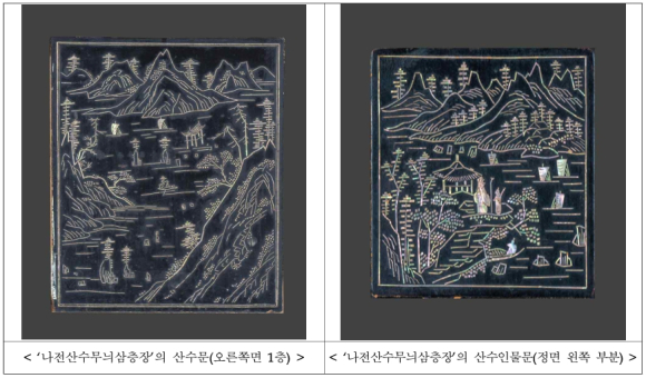 「나전산수무늬삼층장」의 정면 전체와 양쪽 측면은 전통 회화와 공예가 결합된 산수문(山水文)과 산수인물문(山水人物文)을 위주로 문자(文字), 꽃, 과실, 귀갑문(龜甲文) 등 다양한 나전 무늬로 장식되어 있으며, 정면에 설치된 6개의 문짝 안쪽은 밝고 화려한 색채의 괴석화훼도(怪石花卉圖)로 장식한 점도 중요한 특징이다. * 귀갑문: 거북의 등껍질 모양처럼 겹친 육각형으로 연결된 무늬 * 괴석화훼도: 평범하지 않고 괴상한 모양의 돌(괴석)과 화초가 그려진 그림 * 산수인물문: 산이나 강 등의 자연경관과 인간의 모습을 함께 묘사한 것