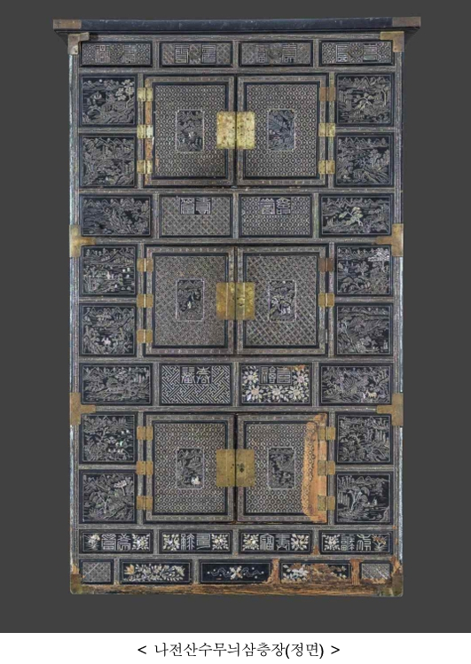| 삼층장은 조선 후기인 1800년대 이후 왕실과 상류층 사이에서 유행한 것으로 알려져 있으며, 왕실의 자녀가 분가하거나 출가할 때 준비하는 생활필수품 중 하나였다. 이번에 지정 예고되는 「나전산수무늬삼층장」은 유래가 명확하고 고급 재료와 정교한 기술이 결합된 대형 가구로서 19세기말 궁중과 상류층에서 사용했던 삼층장의 양상을 보여주는 중요한 유물이자, 경상남도 통영(統營) 가구의 전형적인 특징을 갖고 있어 희소성과 학술적 가치가 매우 높다.