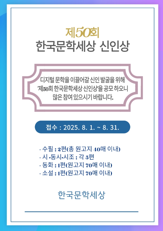한국문학세상(회장·수필가 김영일)은 신인 발굴 프로젝트로 ‘제50회 한국문학세상 신인상’을 2025년 8월 1일부터 31일까지 한 달간 진행되며, 온라인과 모바일을 통해서만 접수한다.