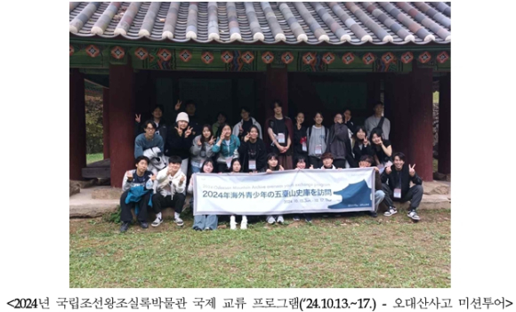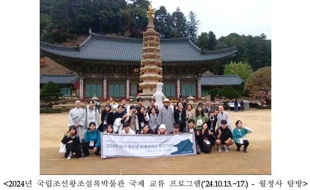 - 국립조선왕조실록박물관 청년 국제교류 프로그램(8.24.~29.)… 월정사 명상과 전통요리 체험, 한일청년 국회포럼(8.28.) 참여도
