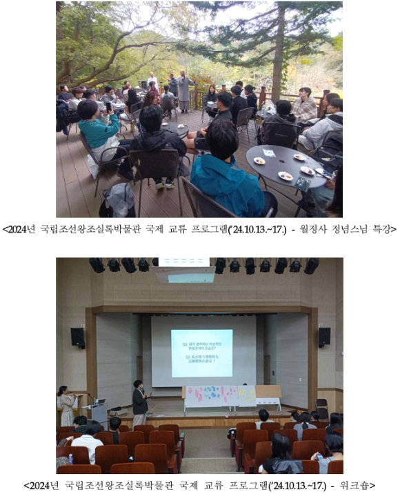 | 참가자들은 사전 예비교육(오리엔테이션)을 거쳐 5박 6일간 강원도 평창의 실록박물관과 오대산사고, 월정사, 그리고 서울 광화문과 창경궁을 탐방하며, 기록·문화유산을 주제로 한 특강과 K-컬처 체험, 공동 연수(워크숍), 국회 공개 토론회(포럼) 등에 참여해 한국의 역사와 문화를 생생하게 경험한다. * 오대산사고(五臺山史庫): 조선왕조실록 등 국가의 서적을 보관하고자 1606년에 건립된 조선시대 지방 외사고 중 한 곳. 월정사는 오대산사고를 지키는 수호사찰이었으며, 그 주지를 수호총섭(守護摠攝)으로 삼아 운영됨.