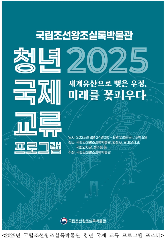 국가유산청 국립고궁박물관 국립조선왕조실록박물관(관장 김정임, 이하 ‘실록박물관’)은 8월 24일부터 29일까지 서울과 평창 오대산 일원에서 ‘세계유산으로 맺은 우정, 미래를 꽃 피우다’를 주제로 「2025년 국립조선왕조실록박물관 청년 국제교류 프로그램」을 개최한다.