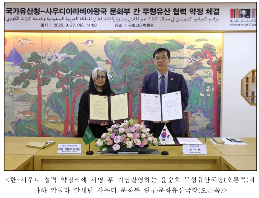 국가유산청, 사우디아라비아 문화부와 무형유산 연구교류 협력- 무형유산 기록물 디지털화 역량과 무형유산 공동연구 양국 협력 강화… 약정식(8.27, 국립고궁박물관)정호 기자 / |