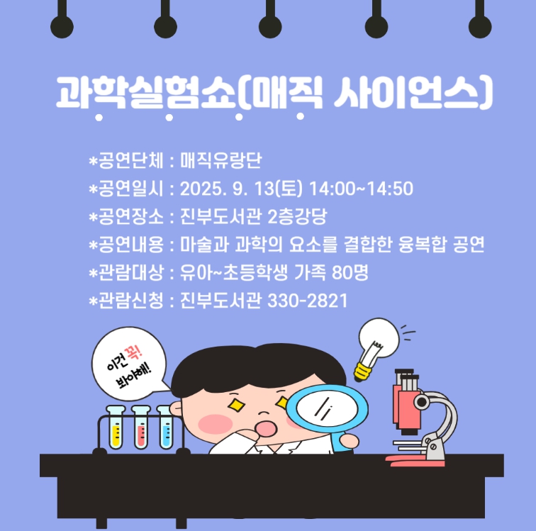 공연은 10년 이상 경력을 가진 전문 마술 단체 ‘매직유랑단’이 맡아, 과학 실험 과정을 마술과 스토리텔링으로 풀어내며 아이들의 상상력과 호기심을 자극할 예정이다.
