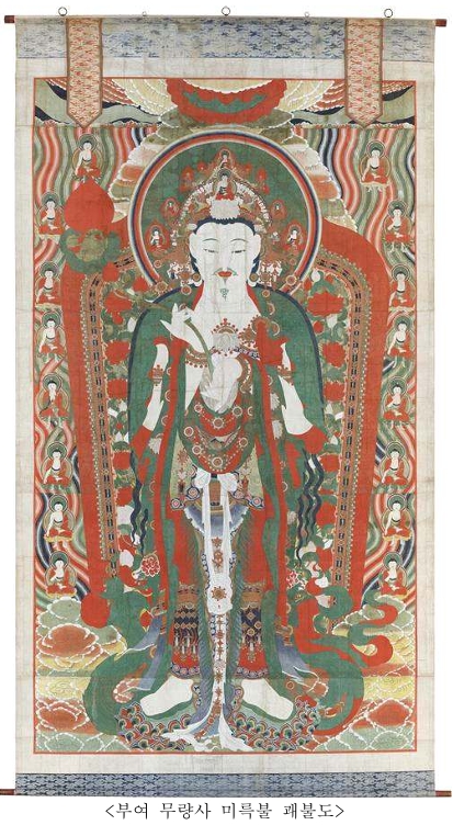 「부여 무량사 미륵불 괘불도(扶餘 無量寺 彌勒佛 掛佛圖)」의 국보 지정은 1997년 7점의 괘불이 동시에 국보로 지정된 이후 약 30년 만에 새롭게 나온 국보 괘불이라는 점에서 의미가 크다. 이 괘불도는 길이가 약 14m에 달하는 초대형 규모로, 머리에 화려한 보관을 쓰고 신체를 아름답게 장식한 모습의 보살형 입상으로 표현되었는데, 이러한 장엄신 괘불의 시작점을 연 작품이라는 점에서 미술사적으로 중요하다. 초대형 작품임에도 불구하고 균형 잡힌 자세와 비례, 적·녹의 강렬한 색채 대비, 밝고 온화한 중간 색조의 조화로운 사용으로 종교화의 숭고함과 장엄함을 효과적으로 구현하였다. * 장엄신(莊嚴身): 괘불에서 머리에 화려한 보관을 쓰고 신체를 아름답게 꾸민 부처님