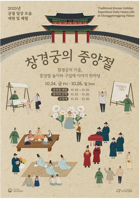 국가유산청 궁능유적본부(본부장 이재필)는 국가유산진흥원(원장 이귀영)과 함께 오는 10월 24일부터 26일까지 창경궁(서울 종로구)에서 전통 명절인 ‘중양절(重陽節)’을 주제로 「2025 궁궐 일상 모습 재현 및 체험」 행사를 개최한다.