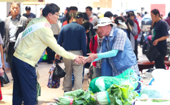 진병영 함양군수, 추석 앞두고 지리산함양시장 민생 살펴상인 격려하며 군민 생활 물가 직접 점검김도형 기자 / |