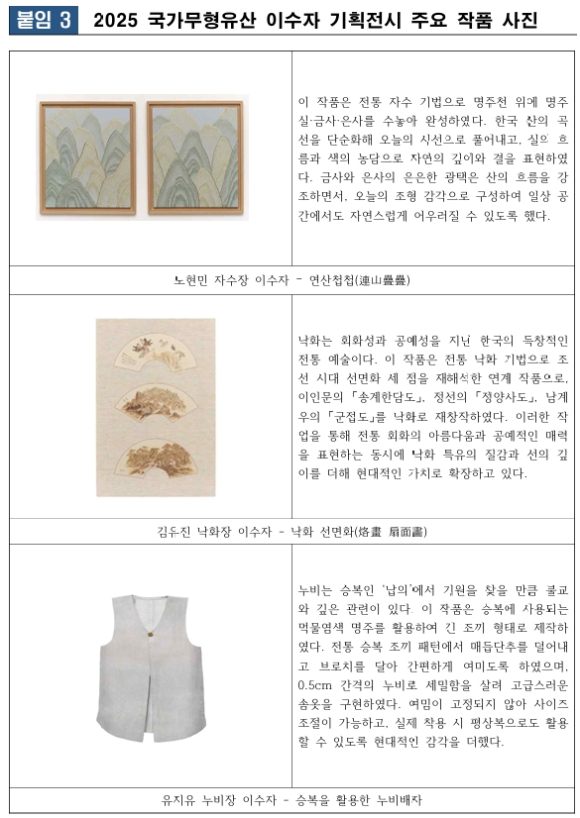 | 이와 더불어, 국가유산청은 이수자 전승 역량 강화를 위한 개인 전시 개최도 지원하고 있다. 10월 17일부터 26일까지 갤러리 무서록(서울 종로구)에서 박선희 매듭장 이수자의 개인전 「자리이다: 엮어야 비로소 풀리는」이, 10월 30일부터 11월 12일까지 모리함 전시관(서울 중구)에서는 박성숙 소목장 이수자의 개인전 「단순(單純)」이 국가유산청의 지원을 받아 각각 개최된다.
