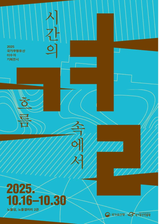 국가유산청(청장 허민)은 국가유산진흥원(원장 이귀영)과 10월 16일부터 30일까지 노들갤러리 2관(서울 용산구)에서 2025년 국가무형유산 이수자 지원사업 기획전시 「결(結), 시간의 흐름 속에서」를 개최한다. * 전시 시간: 10.16.(목) ~ 10.30.(목), 10:00 ~ 19:00 (개막행사: 10.17.(금), 14:00)