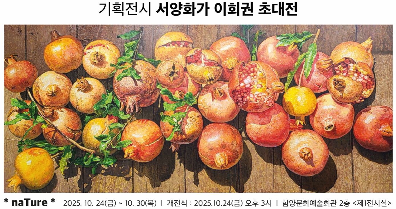 함양군은 오는 10월 24일(금)부터 30일(목)까지 함양문화예술회관 제1전시실에서 2025년 기획 전시로 서양화가 이희권 작가를 초대해 ‘naTure(네이처)’를 개최한다. 개전식은 10월 24일(금) 오후 3시에 열린다.