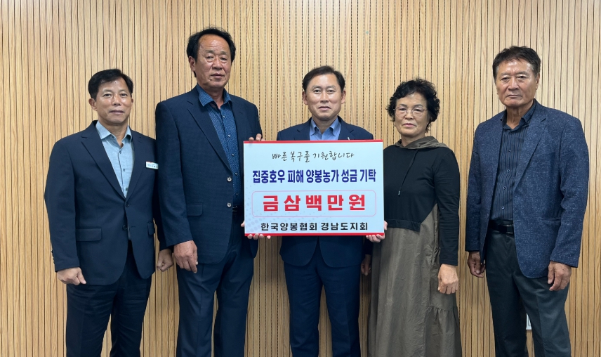 한국양봉협회 경남도지회, 집중호우 피해 양봉농가 성금 전달지난 7월 집중호우로 피해를 입은 한국양봉협회 합천군지부 회원들을 돕기 위해 성금 300만원을 기탁김주영 기자 / |