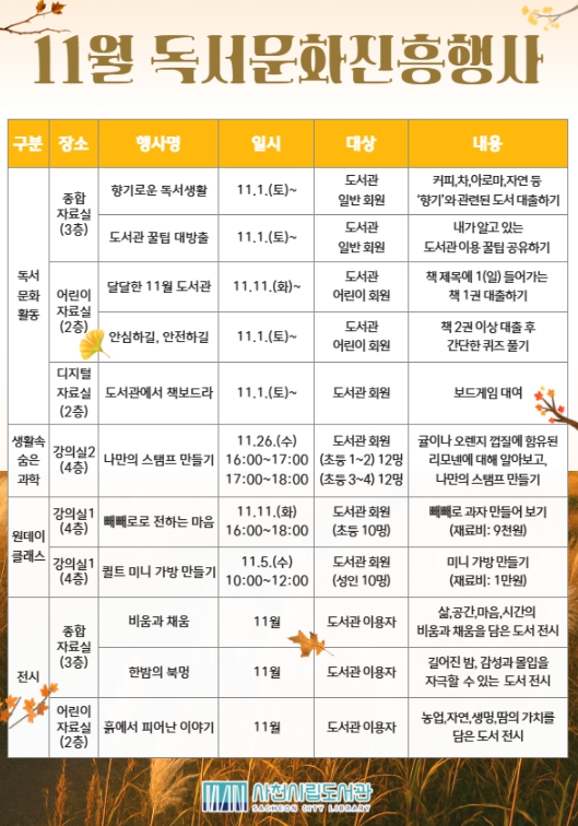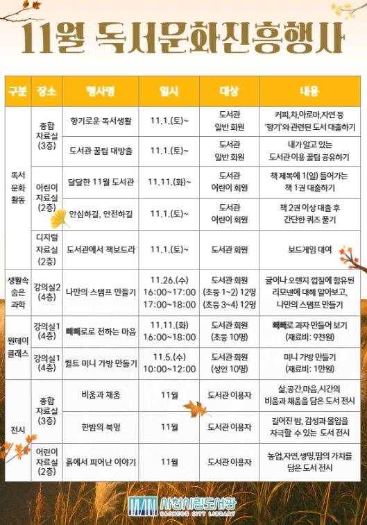 사천시는 사천시립도서관에서 11월 한 달 동안 책과 함께 여유로운 시간을 보내며 감성을 채울 수 있는 다양한 독서문화행사와 체험 프로그램을 운영한다고 17일 밝혔다.