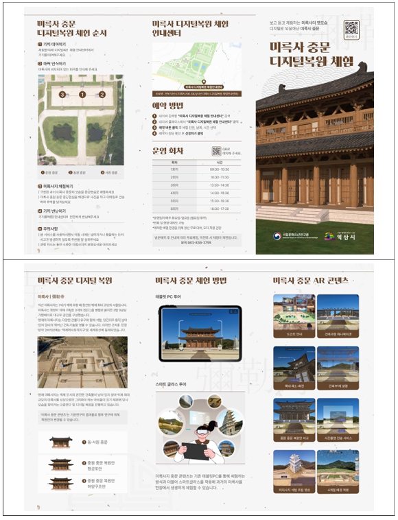 국가유산청 국립문화유산연구원(원장 임종덕)은 익산시(시장 정헌율)와 함께 2026년 2월 8일까지 익산 미륵사지(전북 익산시) 현장에서, 세계유산인 익산 미륵사 중문(동원·중원·서원) 건축물을 증강현실로 디지털 복원해 현장에서 보고 느낄 수 있는 「미륵사 디지털 복원 체험 안내센터」를 운영한다.