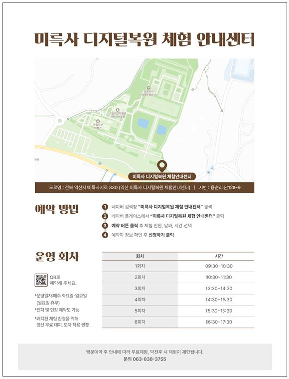 미륵사 중문 디지털 복원 체험은 매주 화요일부터 일요일(월요일 휴무)까지 1일 6회 무료로 운영되며, 회차당 30명씩 참여할 수 있다. 현장 접수(회차당 5명) 또는 네이버에 ‘미륵사 디지털 복원 체험 안내센터’ 검색 후 예약 누리집(회차당 25명)에서 온라인 예약 가능하며, 자세한 사항은 전화(☎063-838-3755)로 문의하면 된다. * 운영 회차: 1회차(09:30~10:30) / 2회차(10:30~11:30) / 3회차(13:30~14:30) / 4회차(14:30~15:30) / 5회차(15:30~16:30) / 6회차(16:30~17:30)