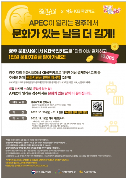 2025 APEC 정상회의가 열리는 경주에서 문화가 있는 날을 더 길게경주 문화시설에서 KB국민카드로 1만원 이상 결제 시 1만원 문화지원금 지원김주영 기자 / |